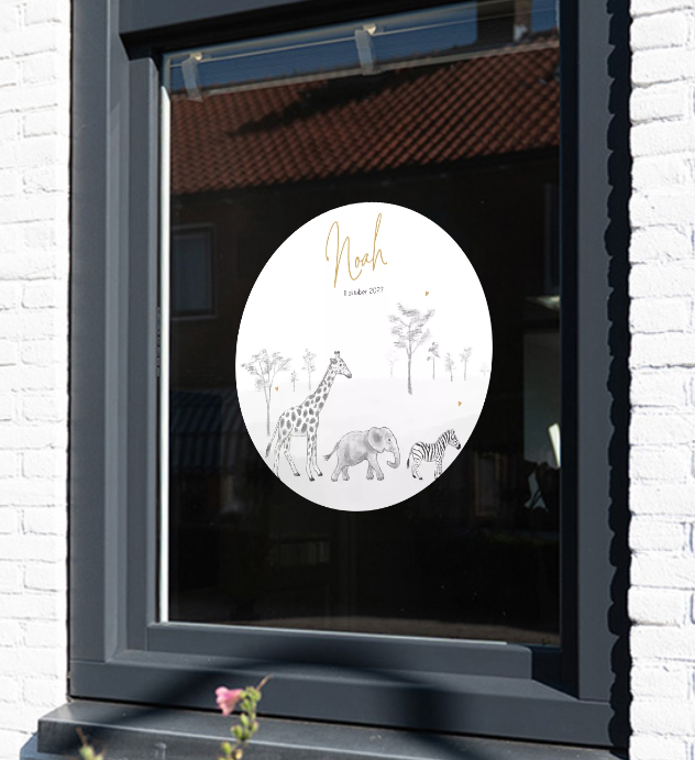 Een hippe ronde raamsticker kindje geboren met jungle / safari thema met dieren, giraf, olifant en zebra. Personaliseer naar wens