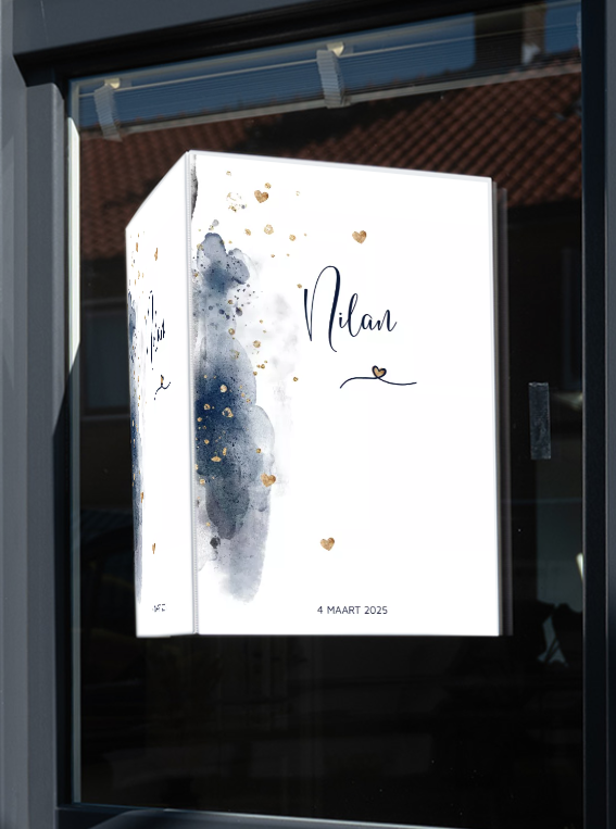 Raambord aankondiging staand. Watercolor blauw in een stoer design met goudlook spetters en hartjes (9966)