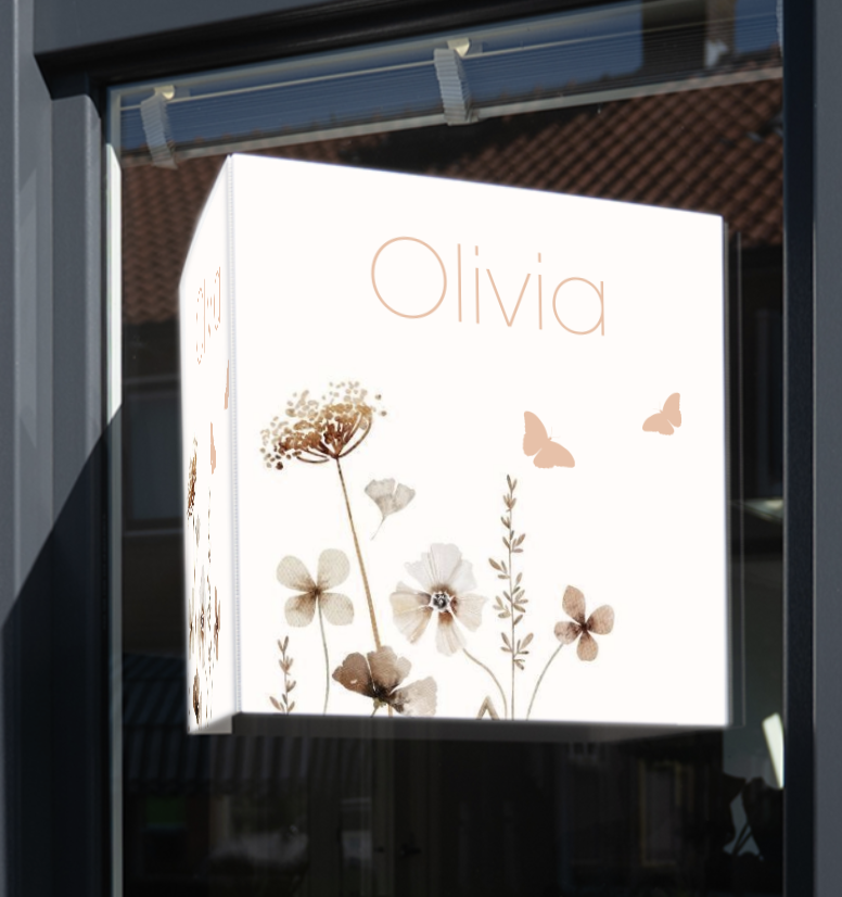 Raambord geboorte voor een meisje in bijzondere boogvorm met veld bloemen en vlindertjes. (24636)