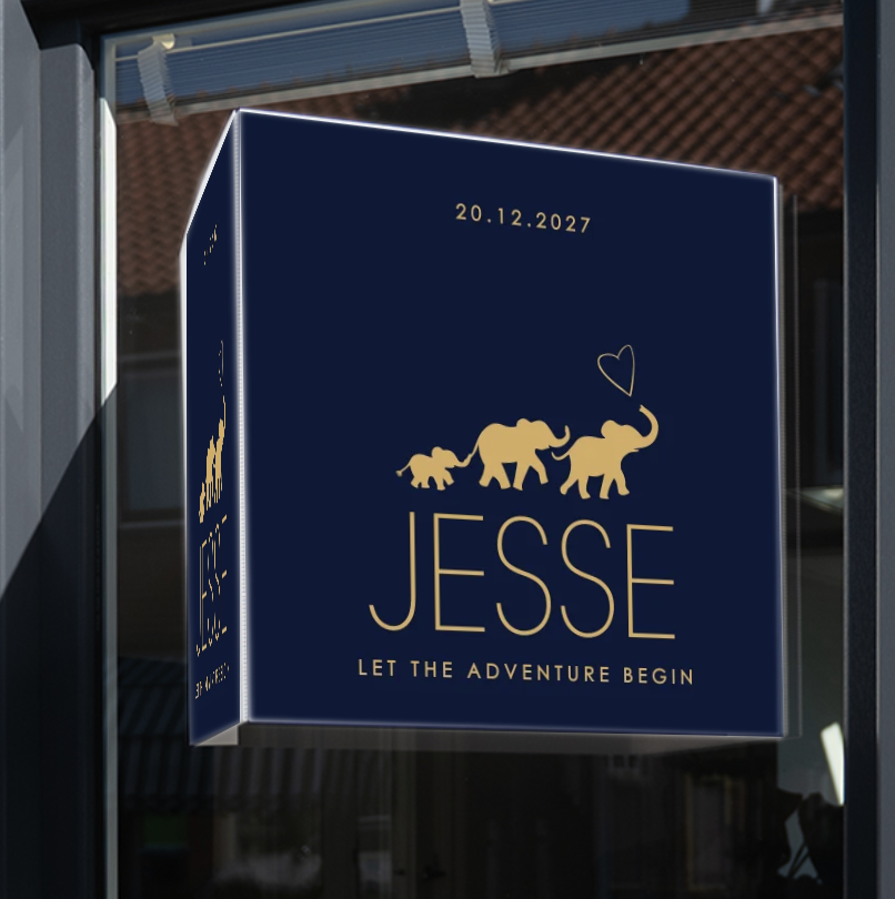 Geboortebord met familie olifant in folie. Bewerk het in de editor en kies je favoriete lettertype en achtergrondkleur. (10172)