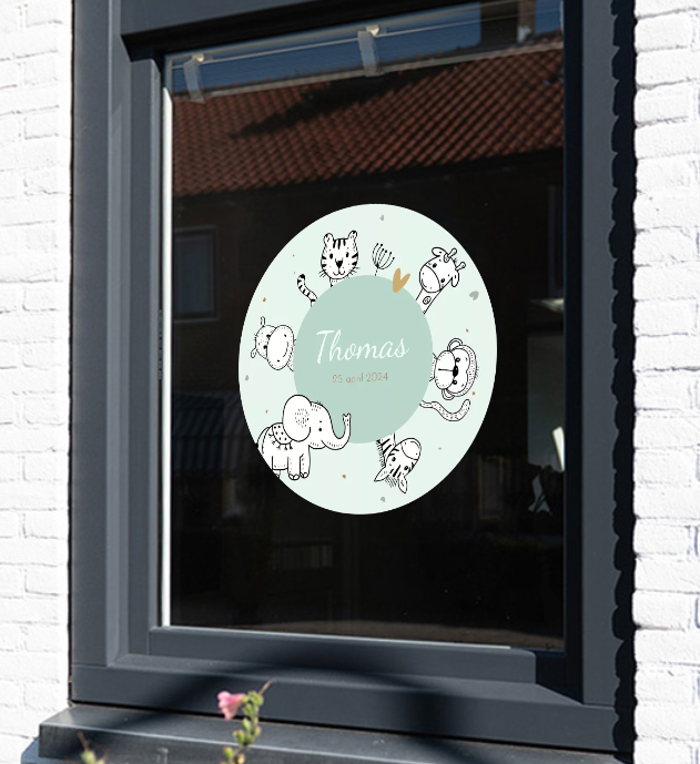Sticker geboorte raam 80cm jongen met safari dieren rond een groene cirkel met confetti en een lichte achtergrondkleur. (22074)