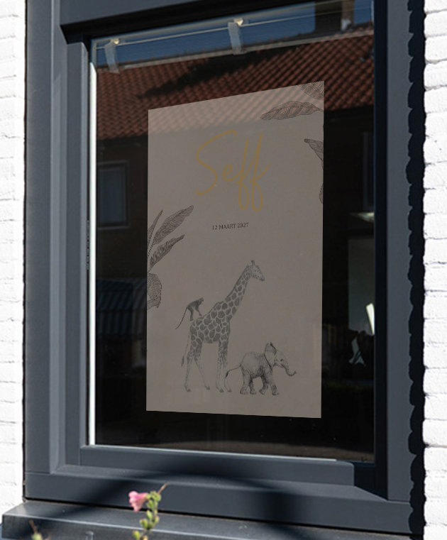 Geboortekaartje jongen jungle thema. Dit is een stoer langwerpig staand formaat van 10x21 cm en de naam staat in letters van goudfolie foliedruk .