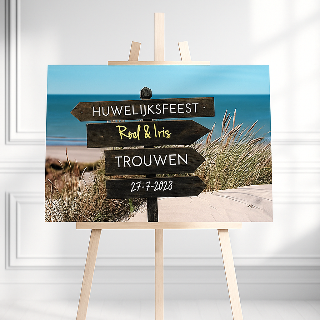 Welkomstbord feest trouwen strand en zee thema met wegwijsborden. (21415)