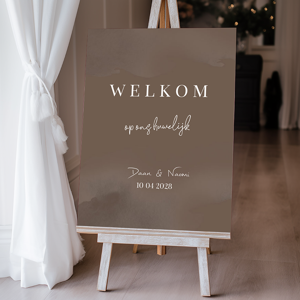 Welkomstbord in bruine kleur zandkleur met een minimalistisch design. (23689)