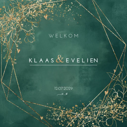Welkomstbord met goud kleurige bloemen, hartjes op een donker groene achtergrond. (24286)