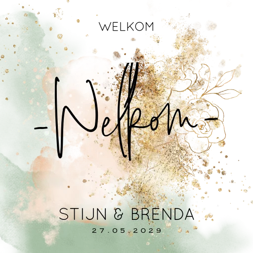 Welkomstbord met groen en roze aquarel en goud kleurige spetters
