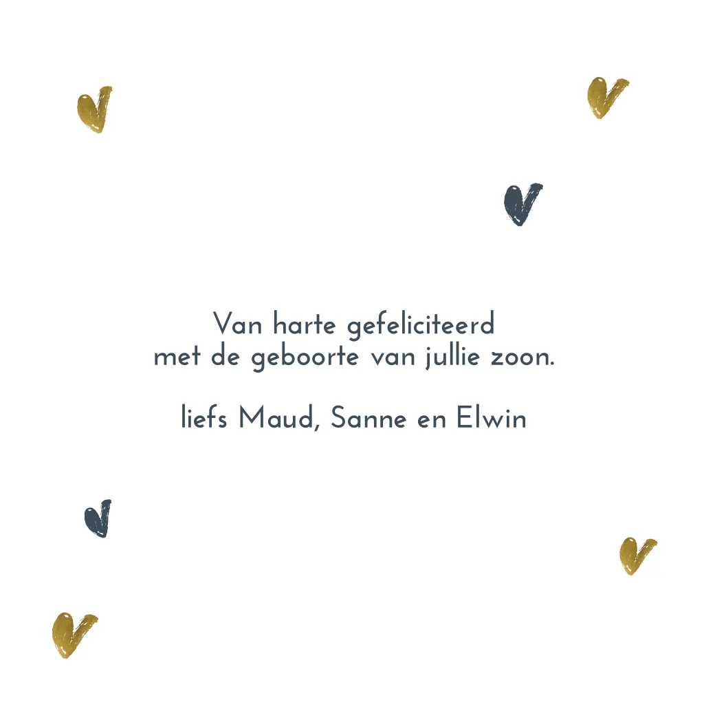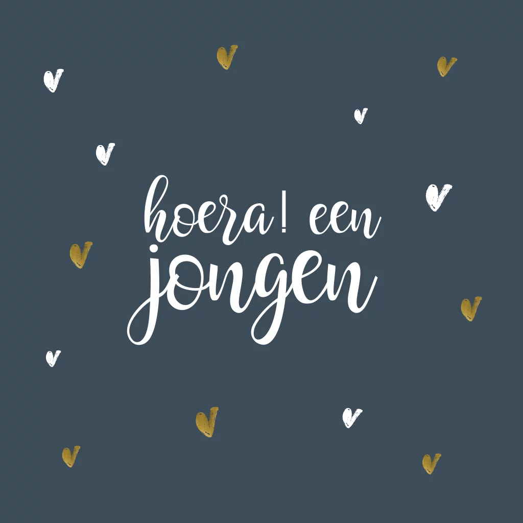 Stoer felicitatie kaartje voor een geboorte van een jongen. Op een donker blauwe ondergrond met hartjes. (44444)
