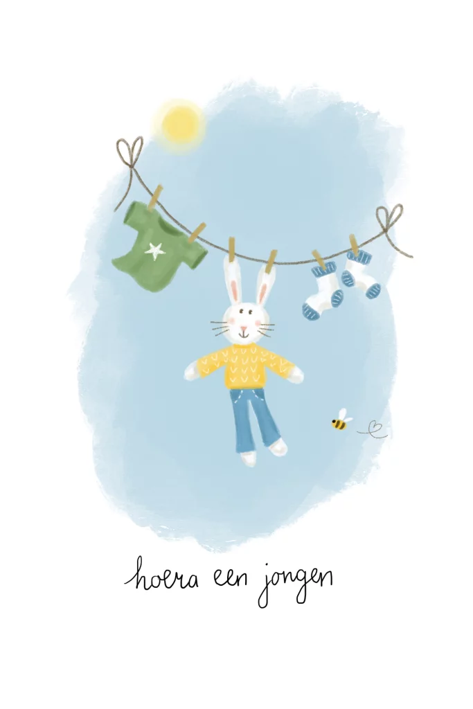 Een vrolijke wenskaart voor de geboorte van een jongen met konijn aan waslijn. (24088)