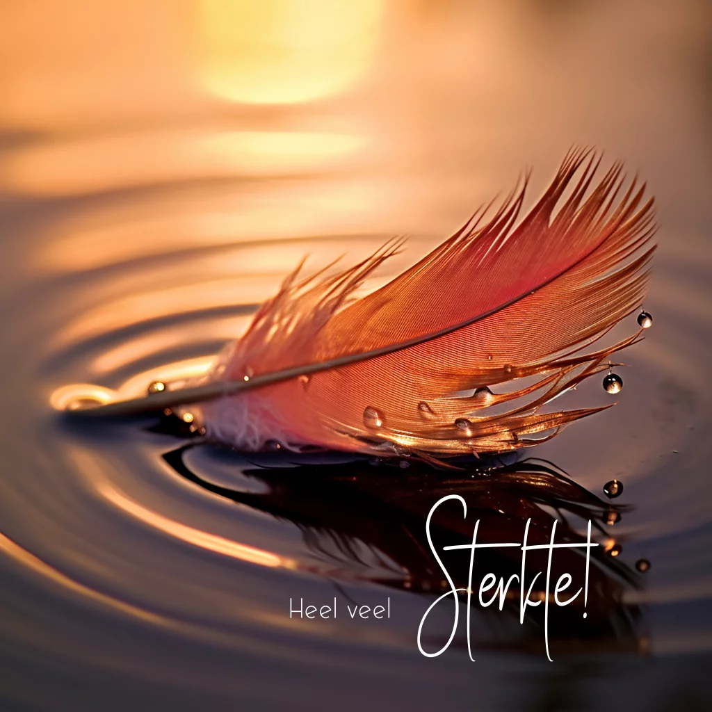 Een veer op het water met tegenlicht van de zonsondergang. Een stijlvolle kaart om sterkte te wensen bij verdrietige gebeurtenissen. (24177)