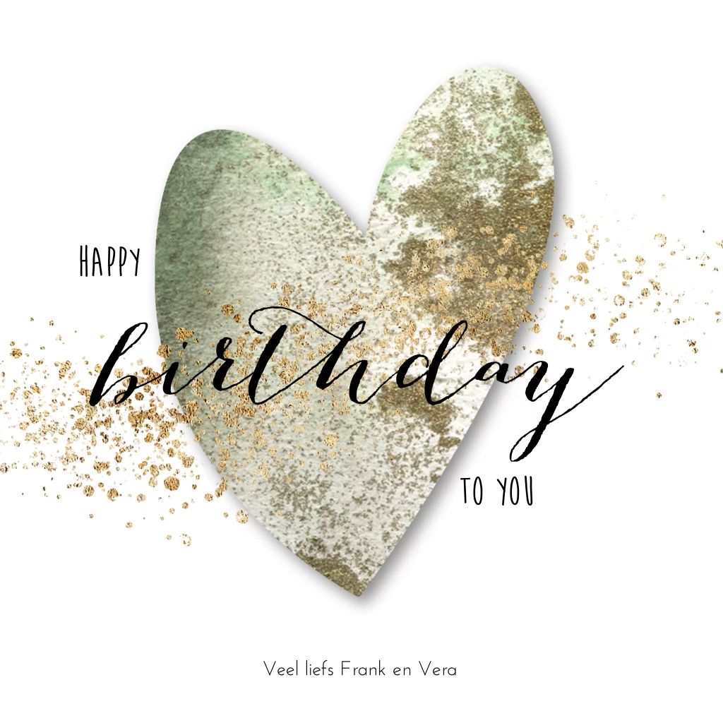 Wenskaart verjaardag met groot groen hart en goudkleur spetters. (44444)
