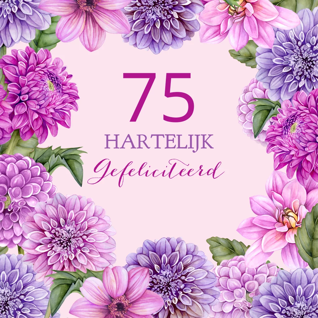 Wenskaart met felicitatie verjaardag met mooie dahliabloemen gemaakt in aquarel. (24032) Leeftijd en teksten zijn naar wens aan te passen.