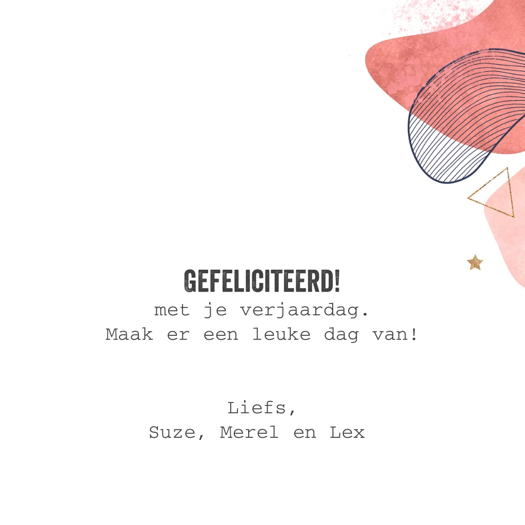 Hippe felicitatiekaart voor een verjaardag. Met grafische watercolor geovormen speels verdeeld over de kaart. Met zachte roze pastelkleuren. (44444)
