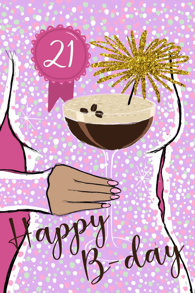Een hippe verjaardagskaart met een espresso martini cocktail. Pas zelf de leeftijd en andere teksten aan. En vervang eventueel de achtergrondkleur. (24049)