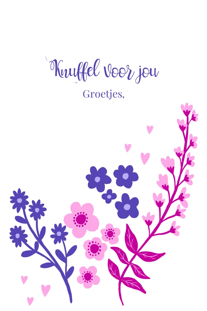 Wenskaart bloemen hartjes roze paars