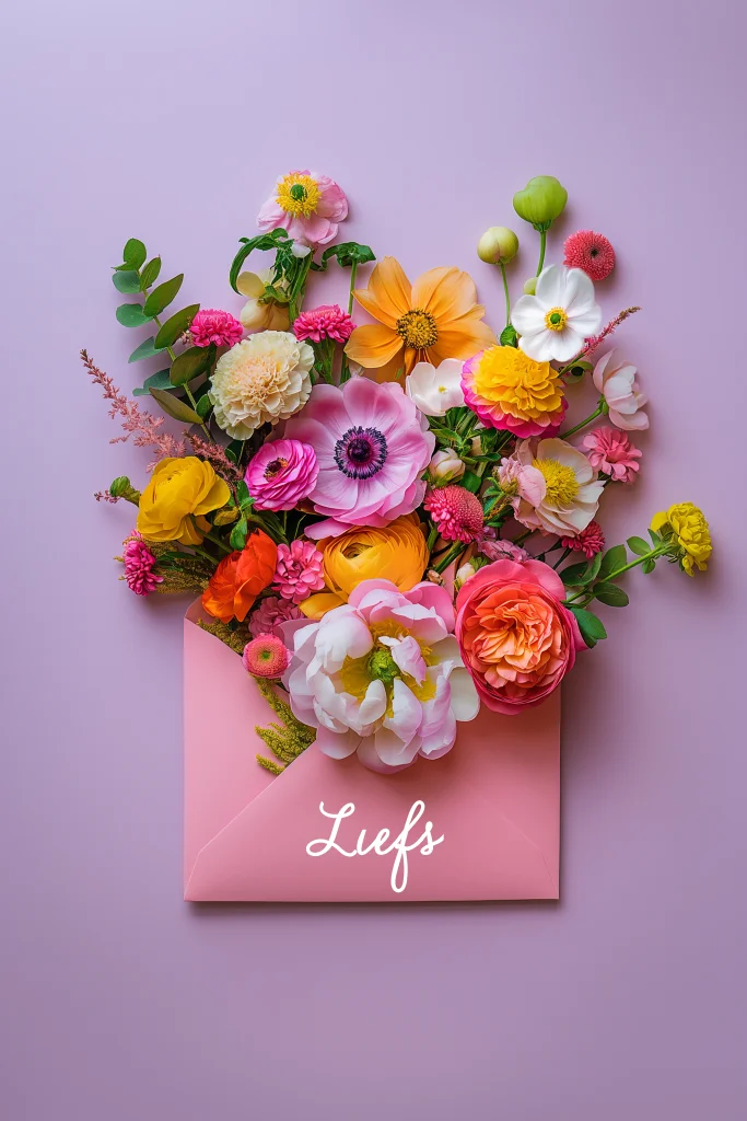 Een prachtige wenskaart om iemand op te fleuren. Een envelop waar prachtige bloemen uit steken. Met de tekst "Liefs". (24053)