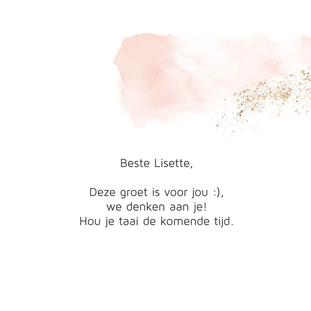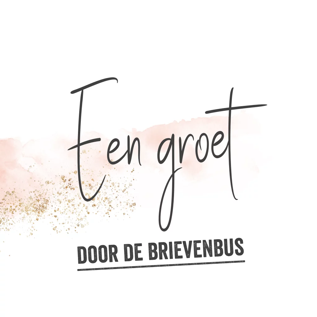 Wenskaart om te laten weten dat je aan iemand denkt. Modern met roze waterverf en goudlook spetters een groet door de brievenbus. (44444)