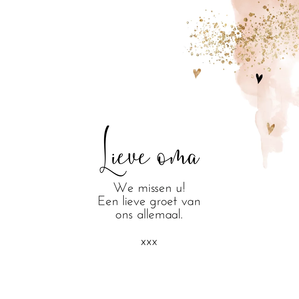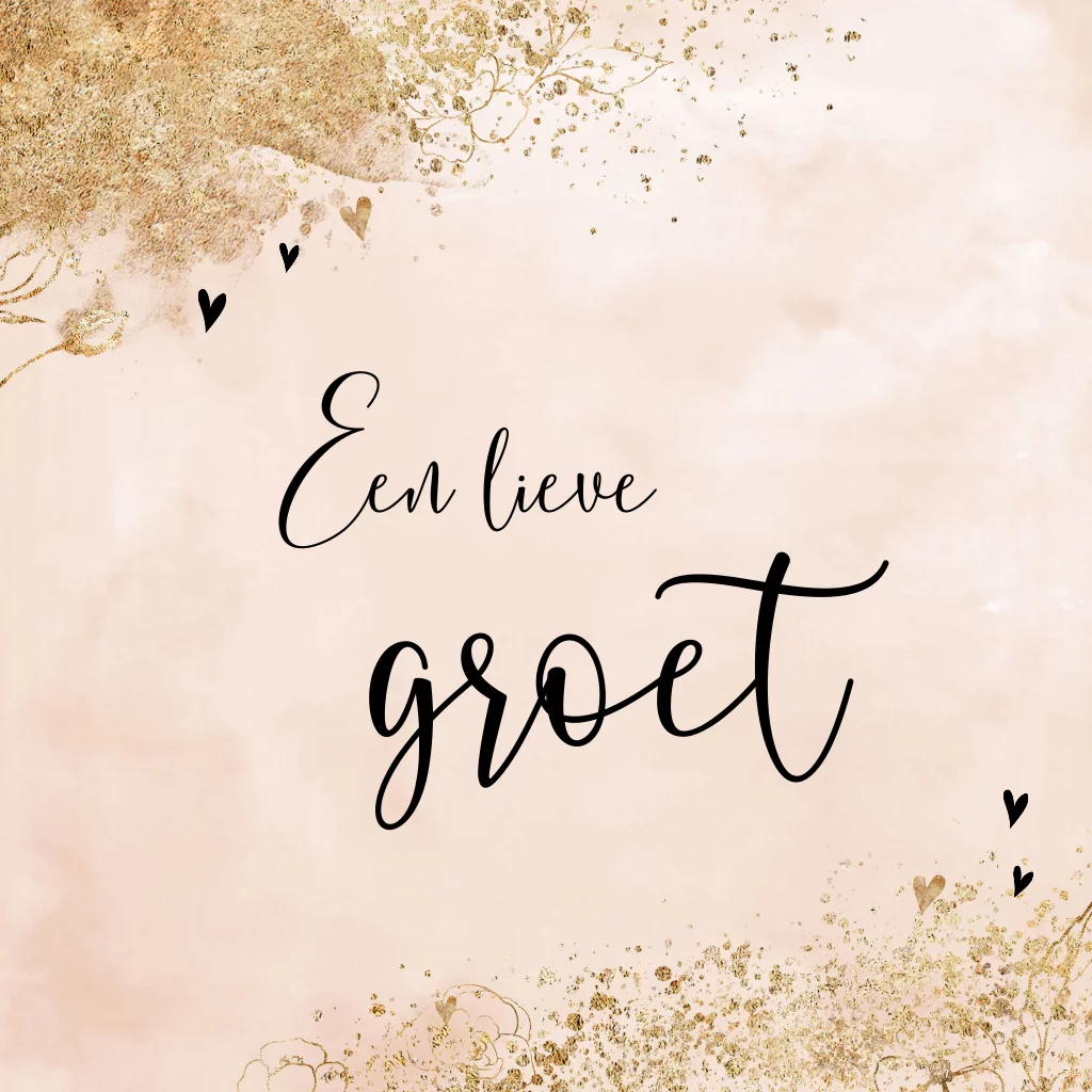 Moderne wenskaart met lieve groet. Met pastel roze verf ondergrond, fijne hartjes en prachtig goudlook gekleurde kwast spetter effect.