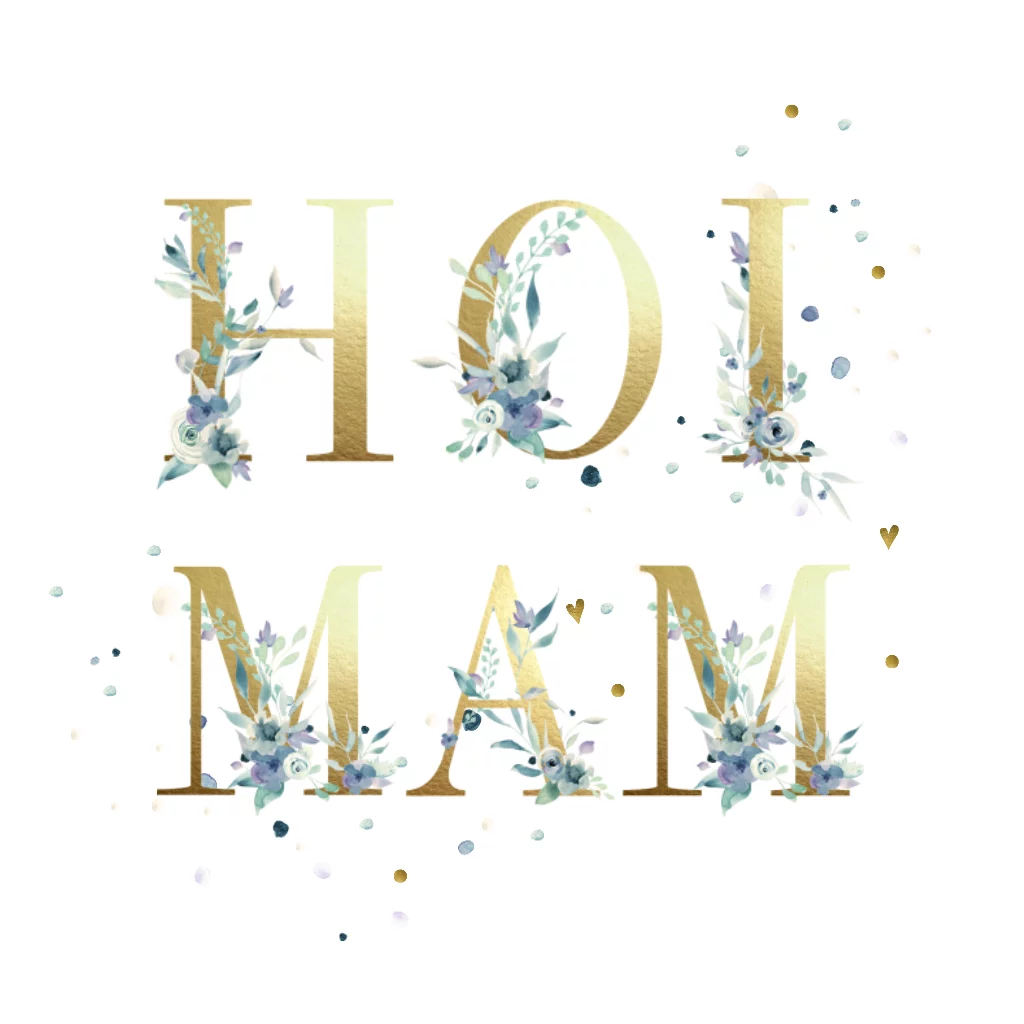 Wenskaart met tekst "hoi mam' in goudlook en daaromheen bloemen en confetti en een mini-hartje. (44444)