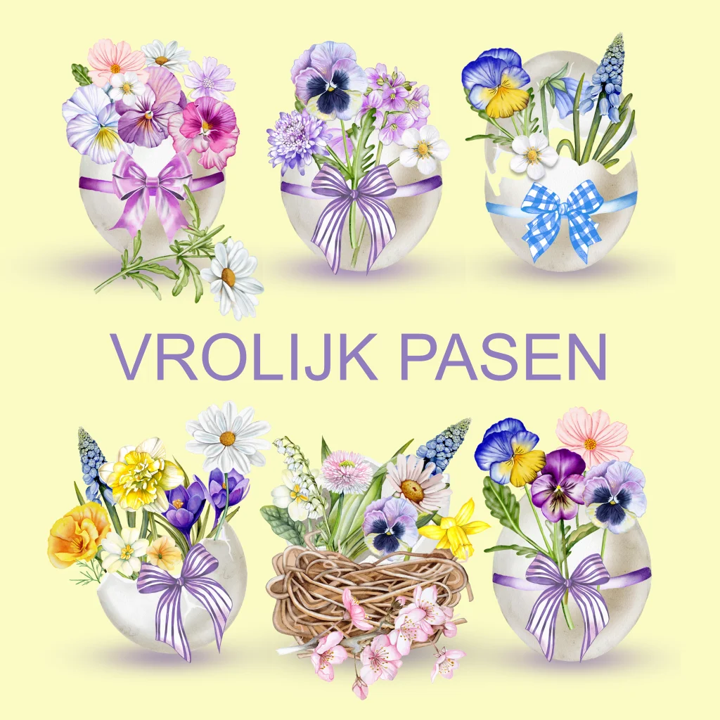 Wenskaart voor pasen met eieren gevuld met bloemen in pastel kleuren blauw, roze en lila. (30360)
